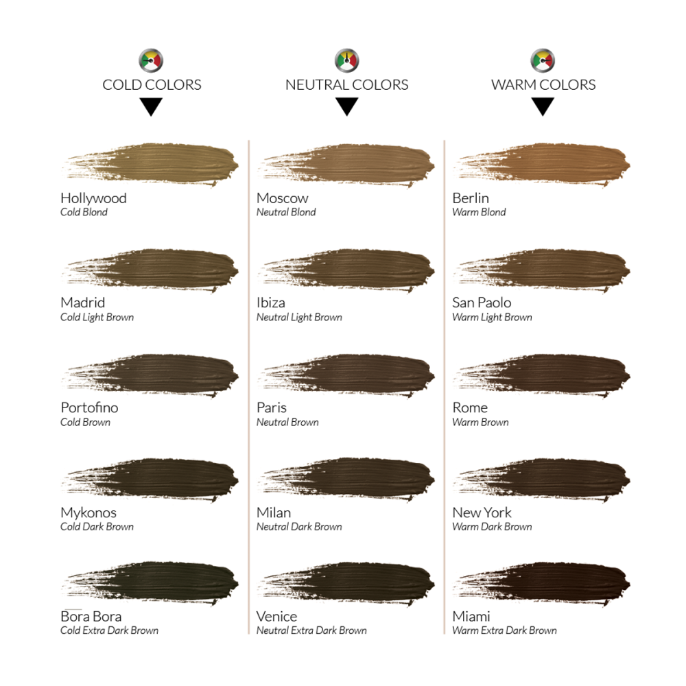 Bora Bora contiene una ligera tendencia fría, o sea verde. Ideal para tratar pieles con un subtono cálido, o para llevar a cabo tratamientos de correción en cejas que viran levemente al rojo.